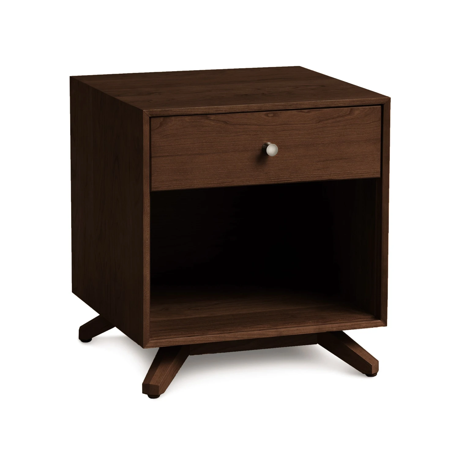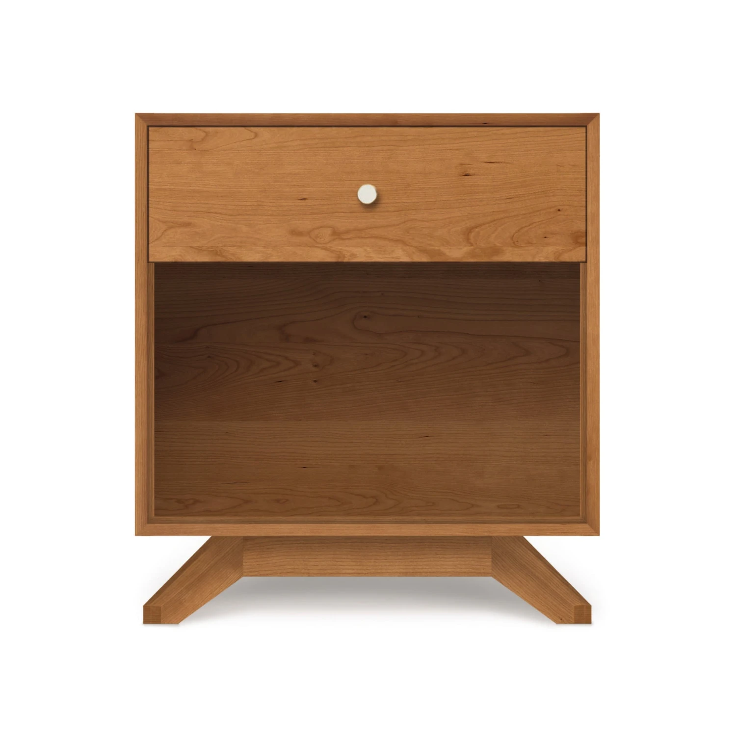 The Copeland Astrid 1-Drawer Nightstand is a testament to contemporary American design and engineering excellence. Named after a Scandinavian goddess, this piece from the Astrid Collection creates an oasis of quiet harmony in any high-end bedroom. Handcrafted in Vermont from sustainably harvested solid cherry wood, it features deeply splayed legs and dramatic cantilevers that define its futuristic silhouette.