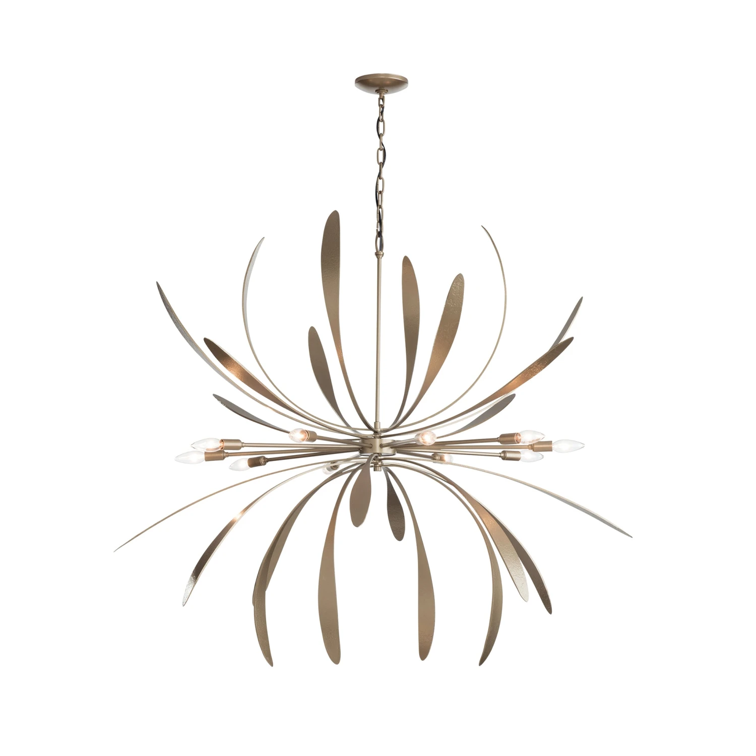 Elevate your interior with the Hubbardton Forge Large Dahlia Chandelier, a masterpiece where industrial strength meets the delicate lines of the natural world. This grand-scale fixture captures the mesmerizing beauty of a blooming dahlia, featuring hand-curved metal petals that unfurl to reveal ten exposed light bulbs. Each piece is a testament to timeless design, casting a sophisticated glow that transforms your bedroom or living space into a gallery of light and shadow.