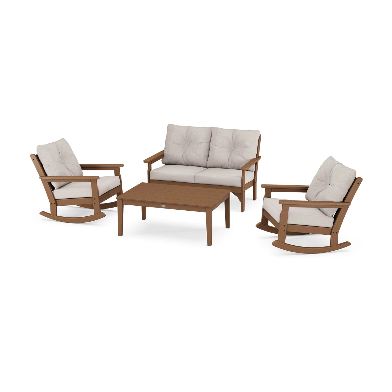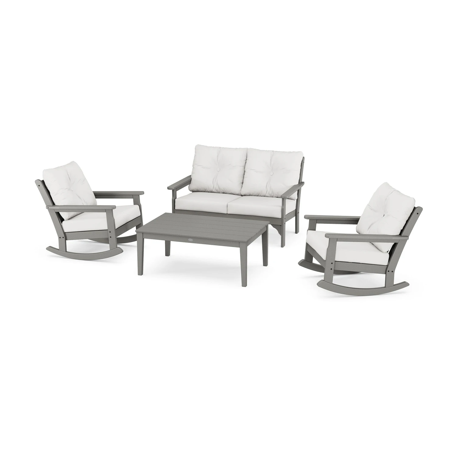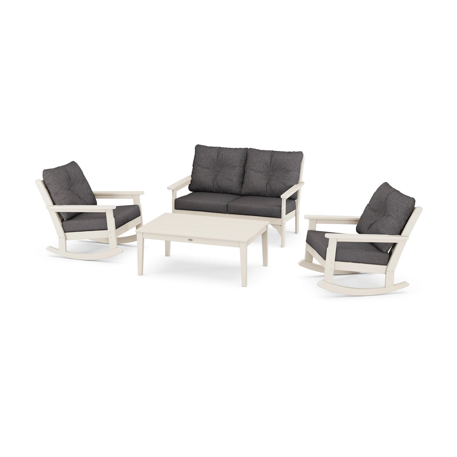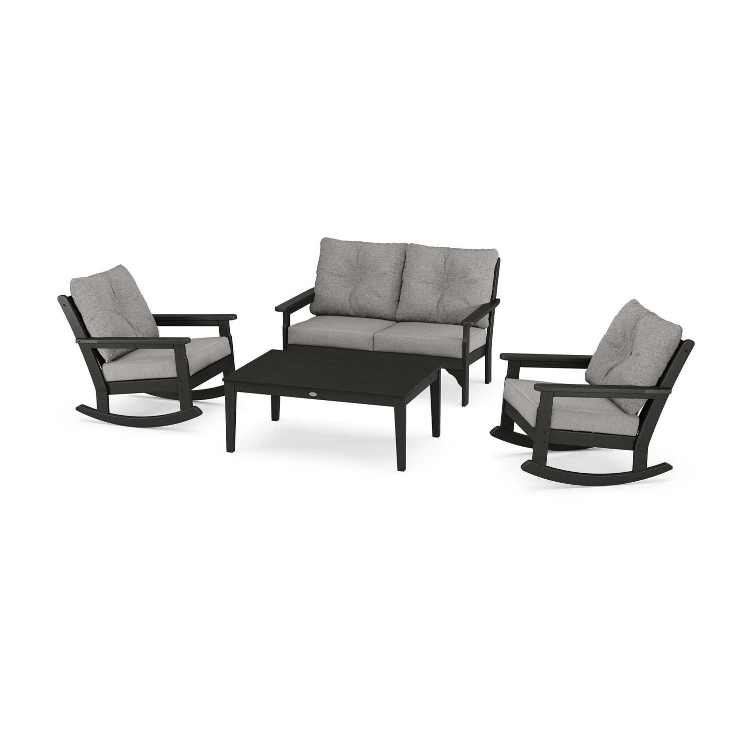 Transform your patio into a serene retreat with the POLYWOOD Vineyard 4-Piece Deep Seating Rocking Chair Set. Designed to capture the elegance of vineyard living, this set invites you to sink into plush, high-performance cushions while enjoying the gentle motion of a classic rocker. Crafted with premium weather-resistant materials, it offers a sophisticated blend of style and enduring comfort for any outdoor space.